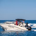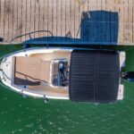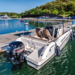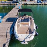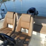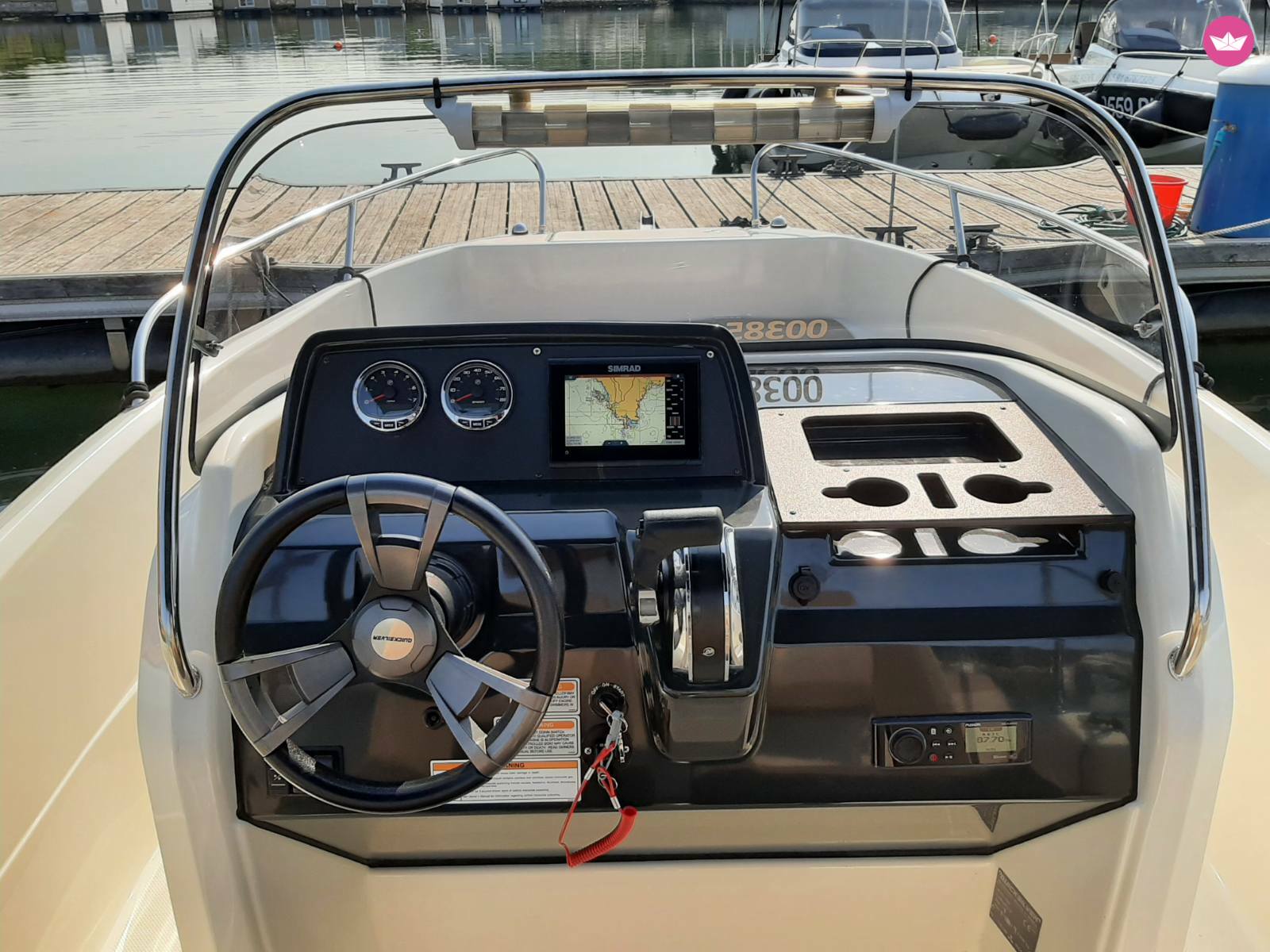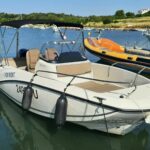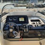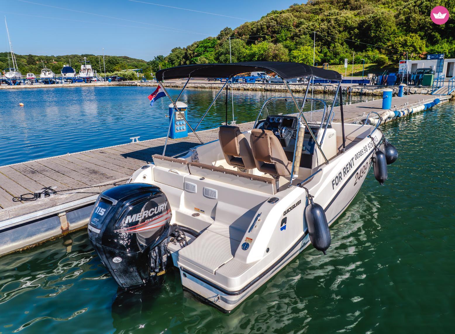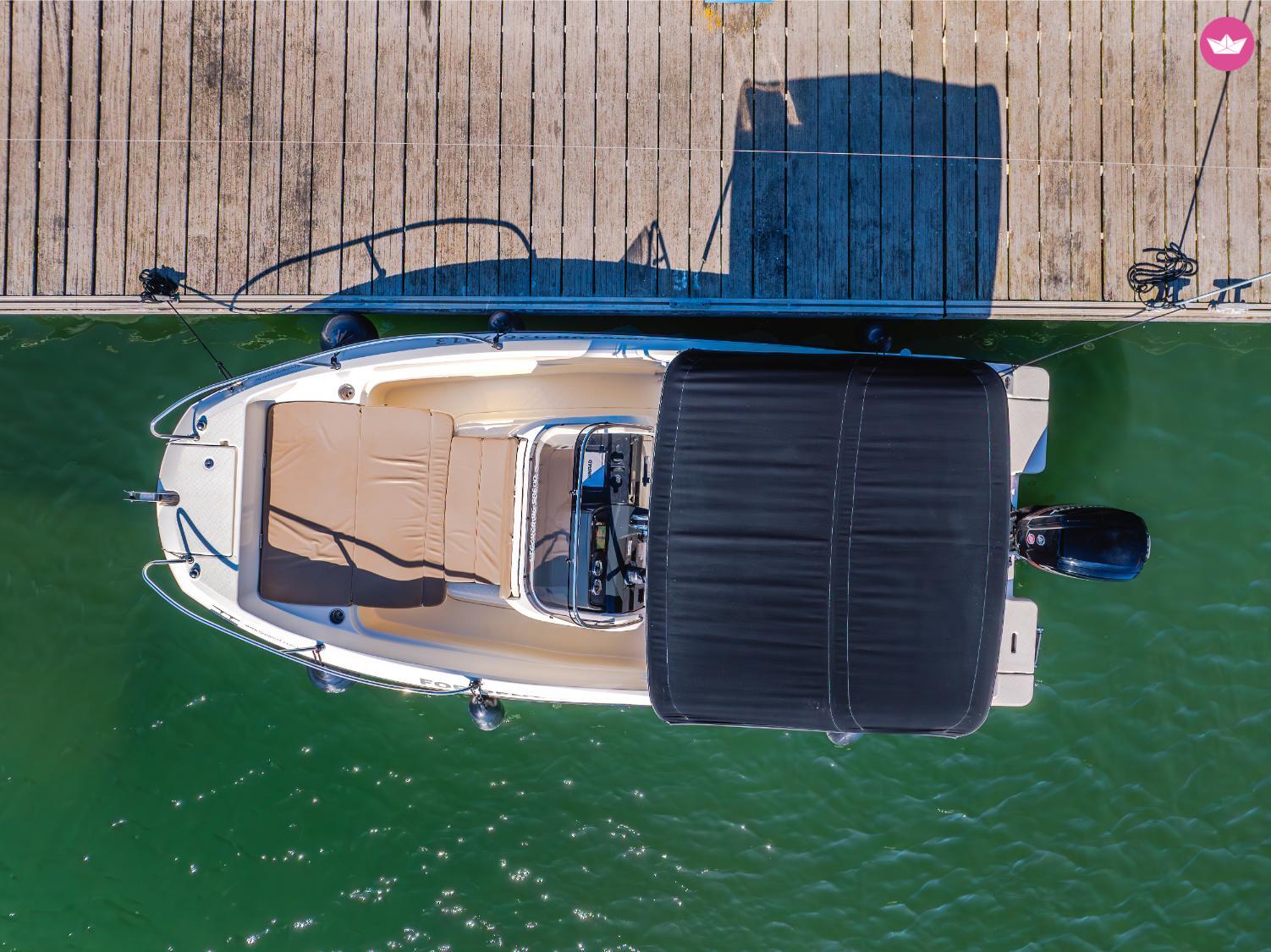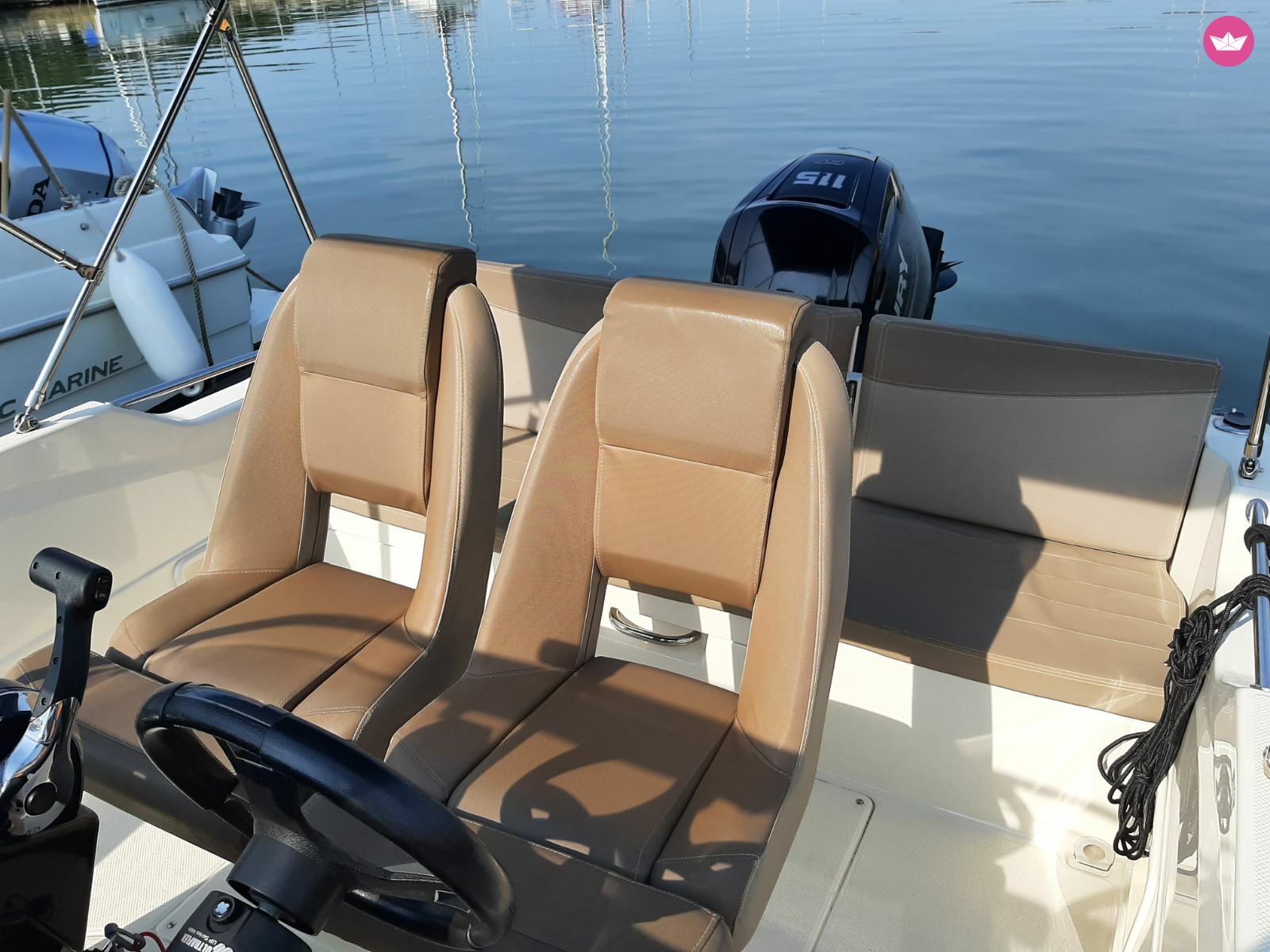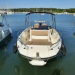 The capacity is 7 people but for your comfort, I would suggest 5 adults or 7 adults with kids to be on board. The boat is from 2018 and very well maintained. From the equipment, you will find bimini, deck shower, table, speakers, swim ladder, and much more. The engine onboard is Mercury with 115 HP.